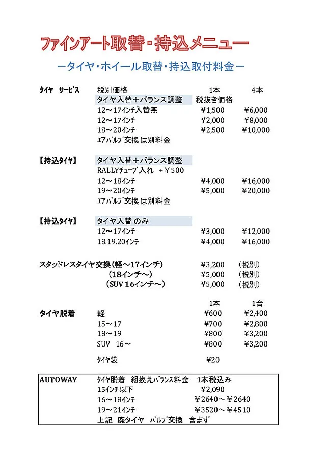 持込タイヤ取替バランス 17インチまで1本 ¥3.300税込み